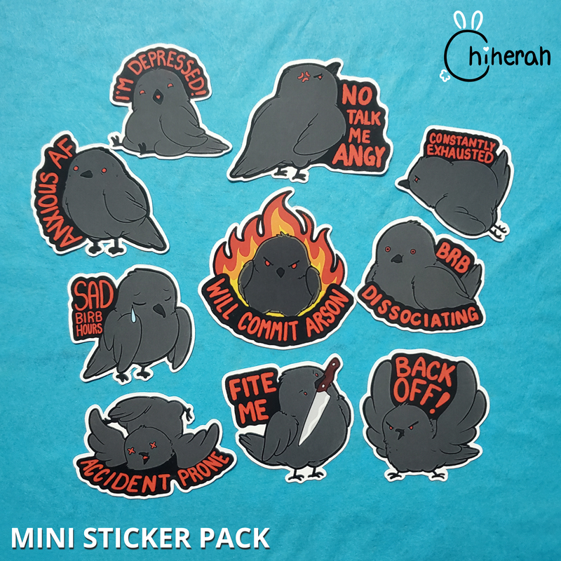 A packaged set of 10 miniature (2″) matte stickers featuring original art of disaster crows. Perfect to hand out to the disastrous birds in your life.